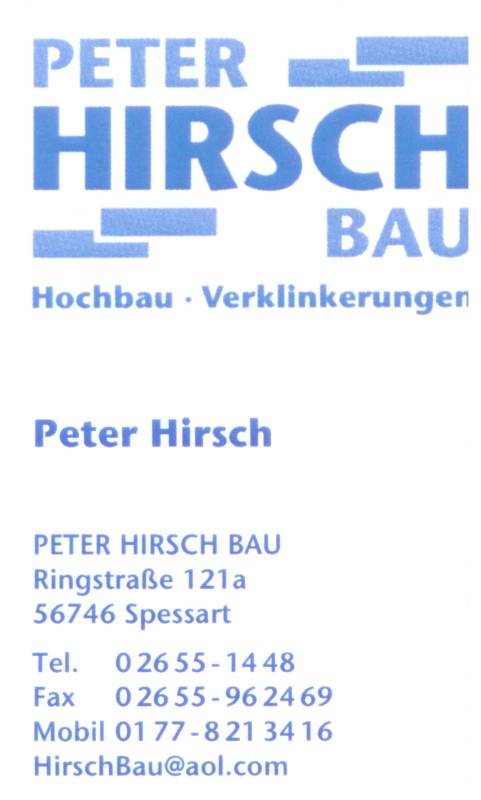 Tel.: 0 26 55 – 14 48 Telefax: 0 26 55 – 96 24 69Mobil: 01 77 – 8 21 34 16E-Mail: hirschbau@aol.com